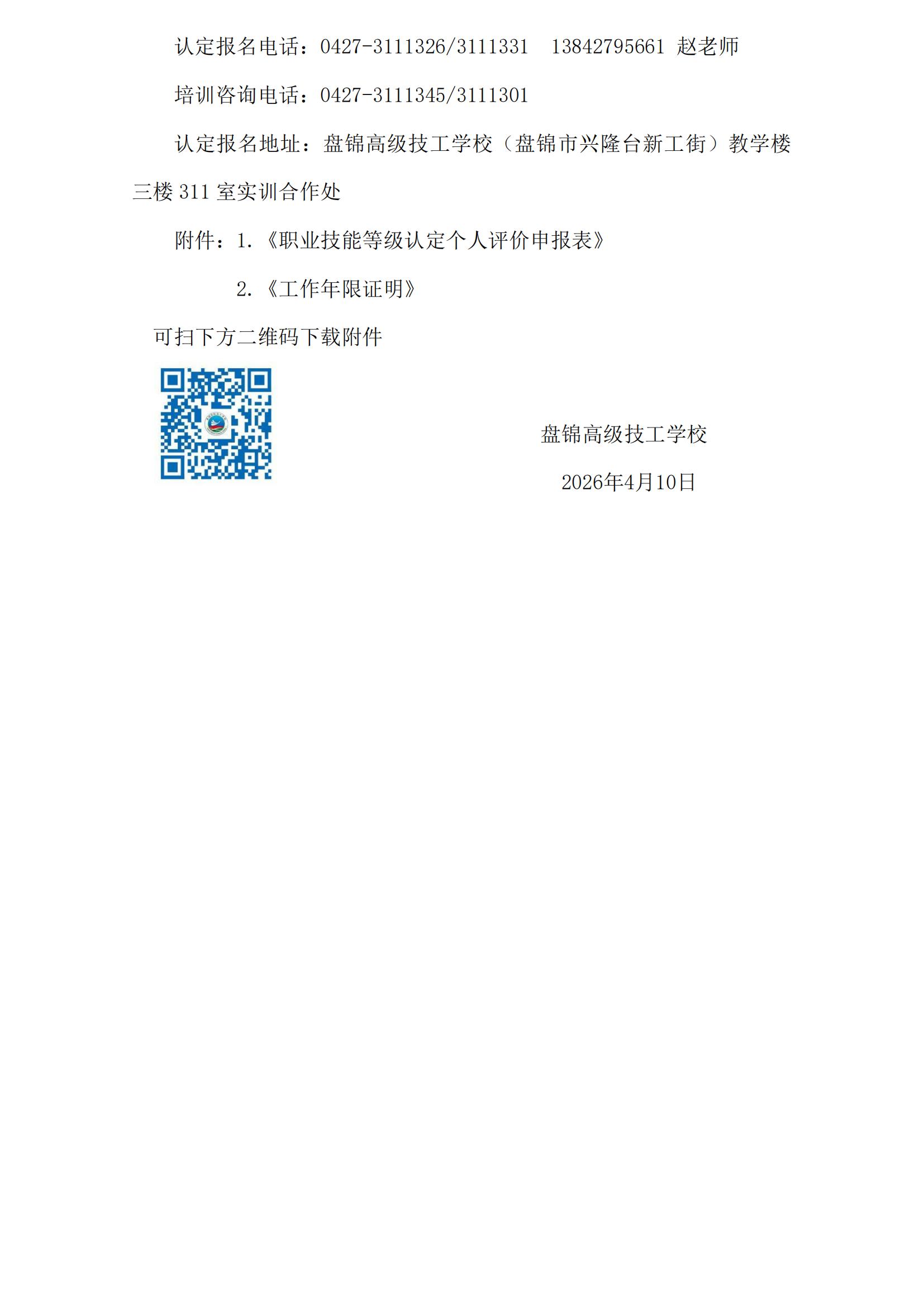 盘锦高级技工学校2026年5月职业技能等级认定公告