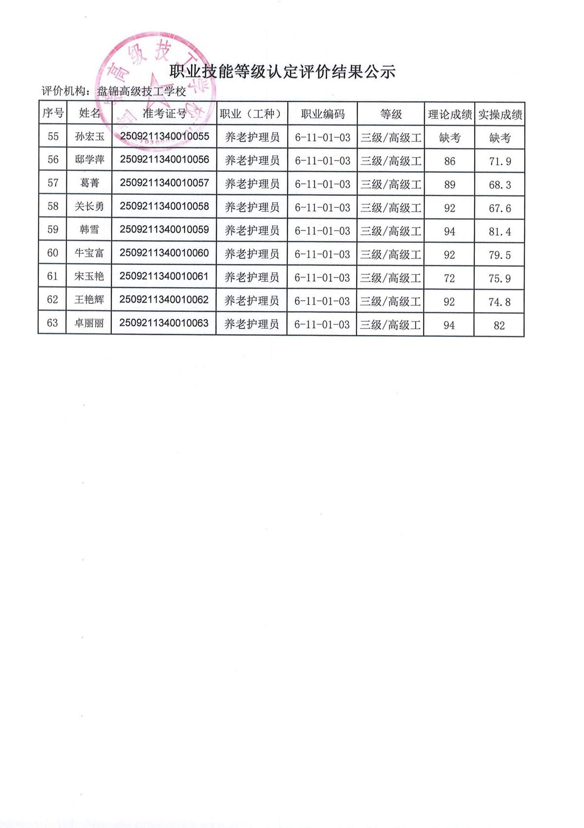 盘锦高级技工学校职业技能等级认定成绩公示(2025年第1批)