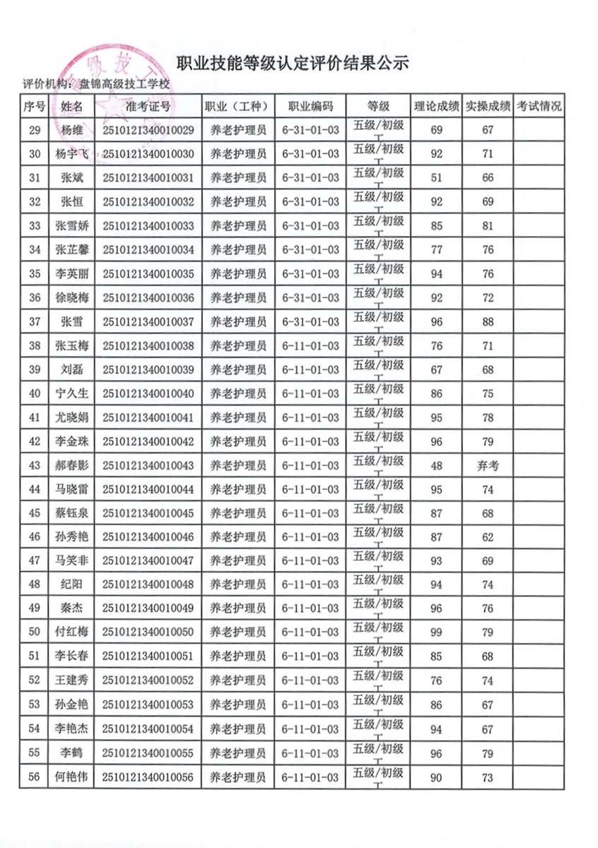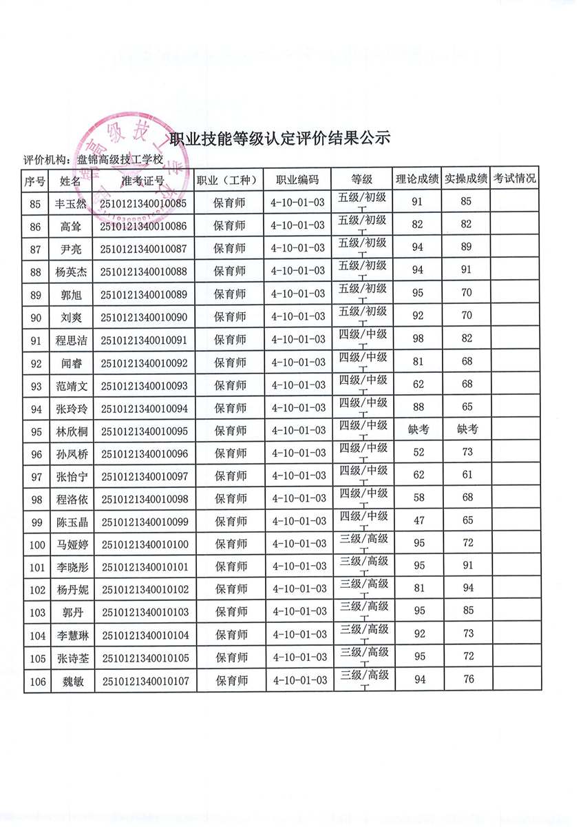 盘锦高级技工学校职业技能等级认定成绩公示(2025年第2批)
