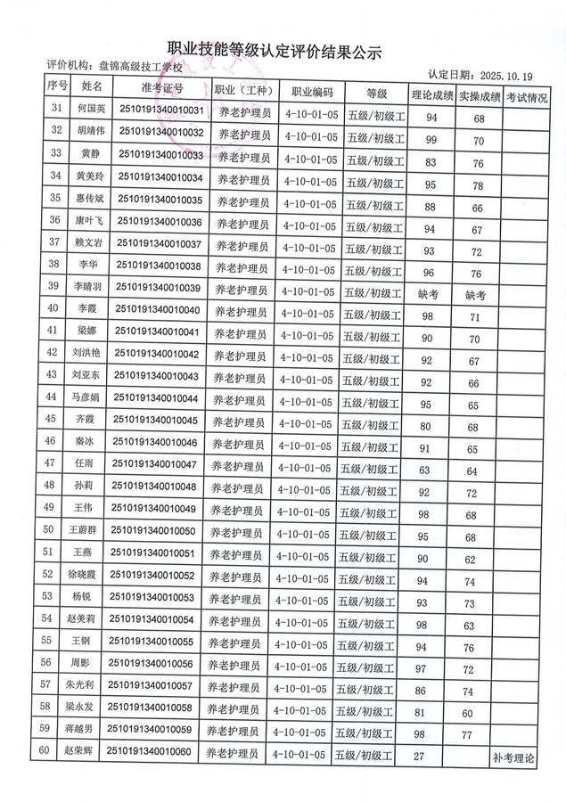 盘锦高级技工学校职业技能等级认定成绩公示(2025年第4批)