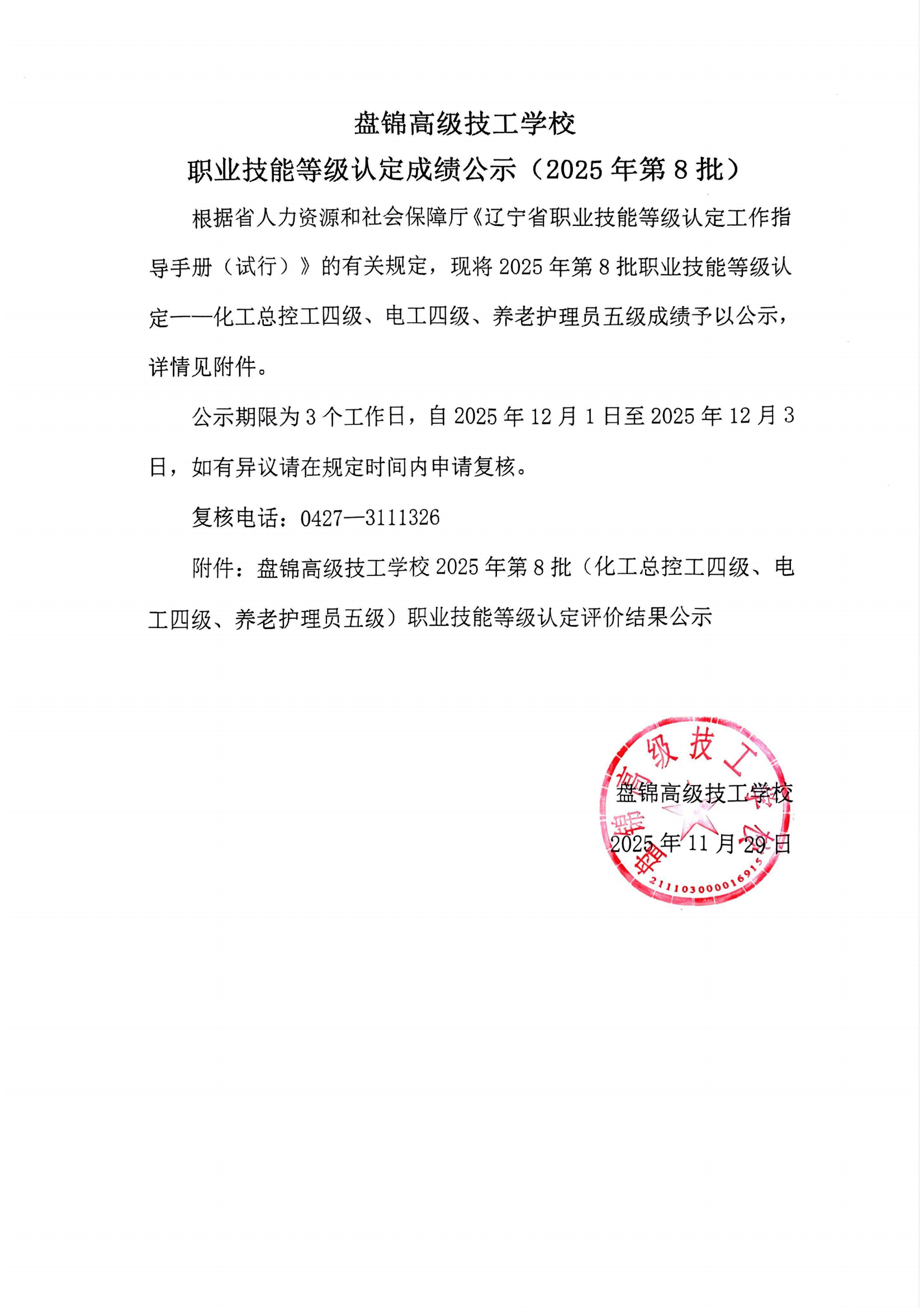 盘锦高级技工学校职业技能等级认定成绩公示(2025年第8批)