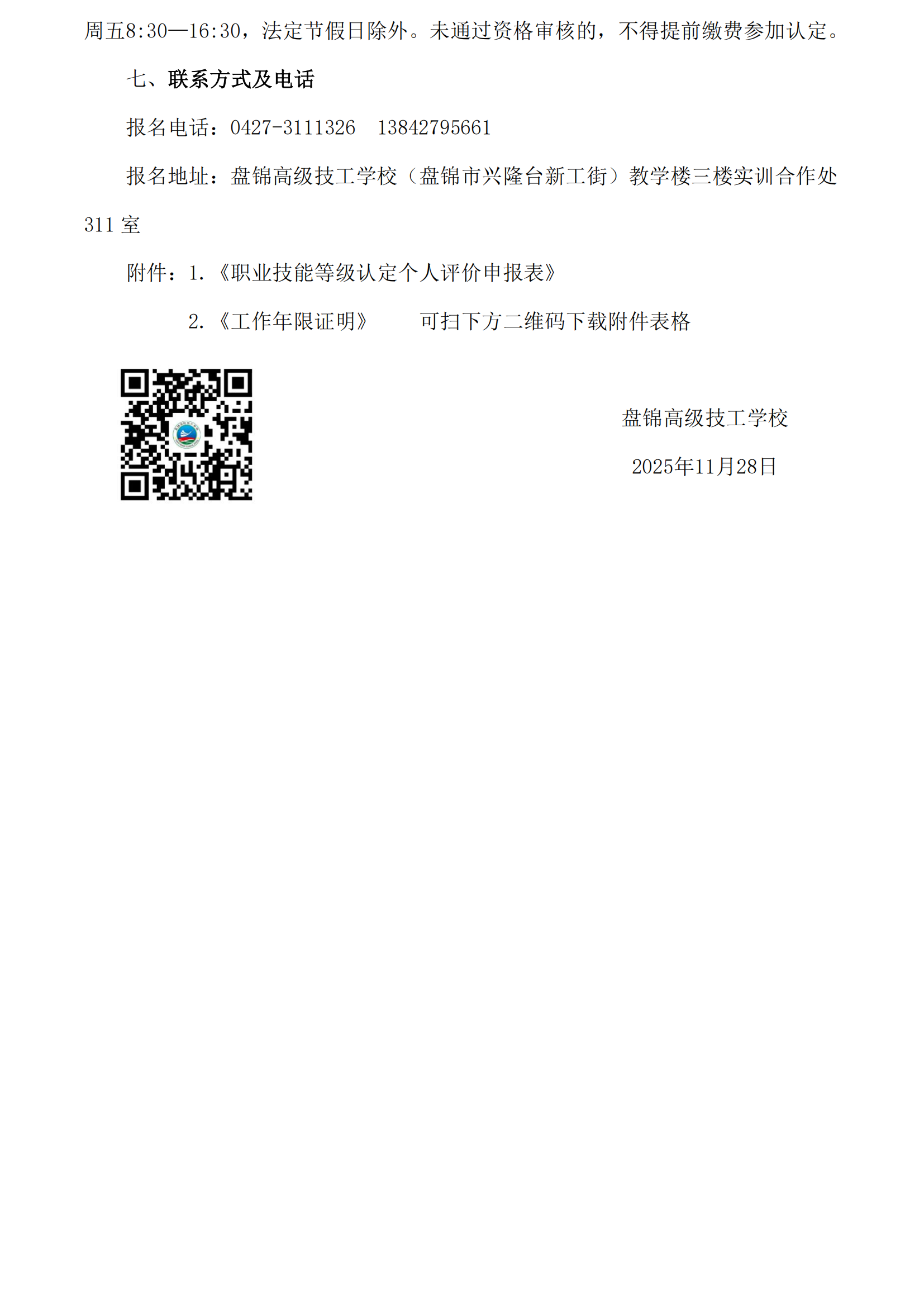 盘锦高级技工学校2025年12月职业技能等级认定公告