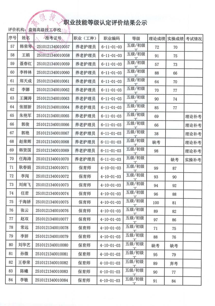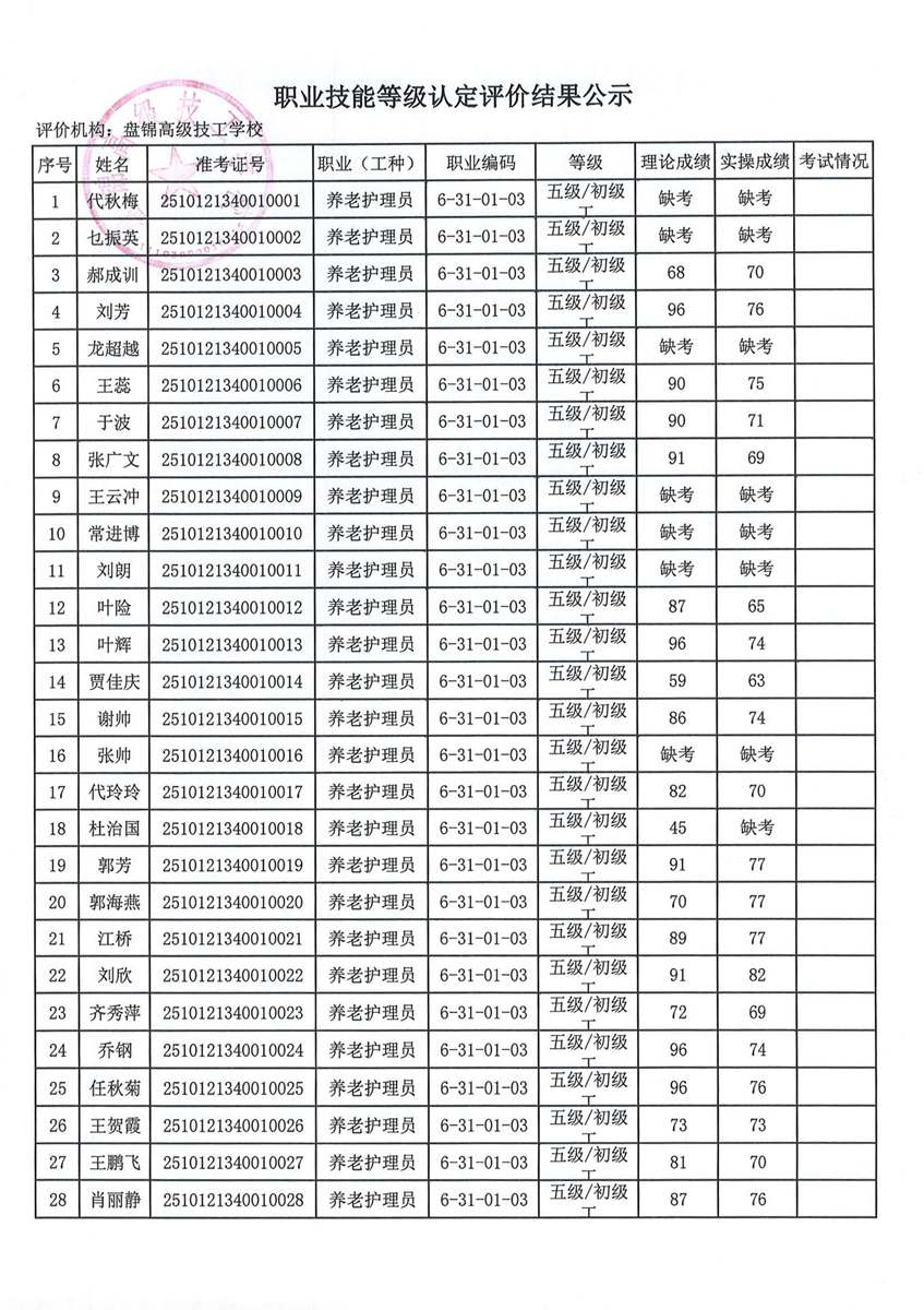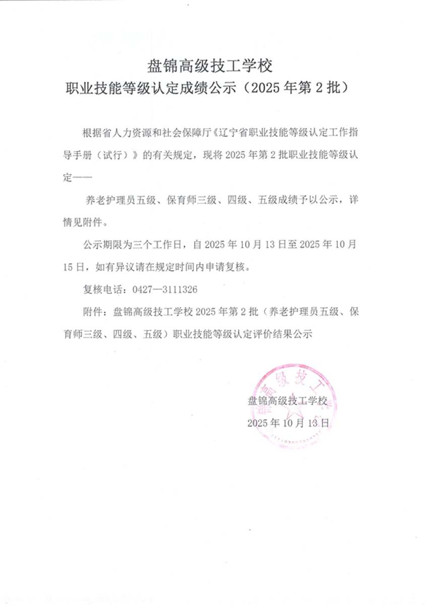 盘锦高级技工学校职业技能等级认定成绩公示(2025年第2批)