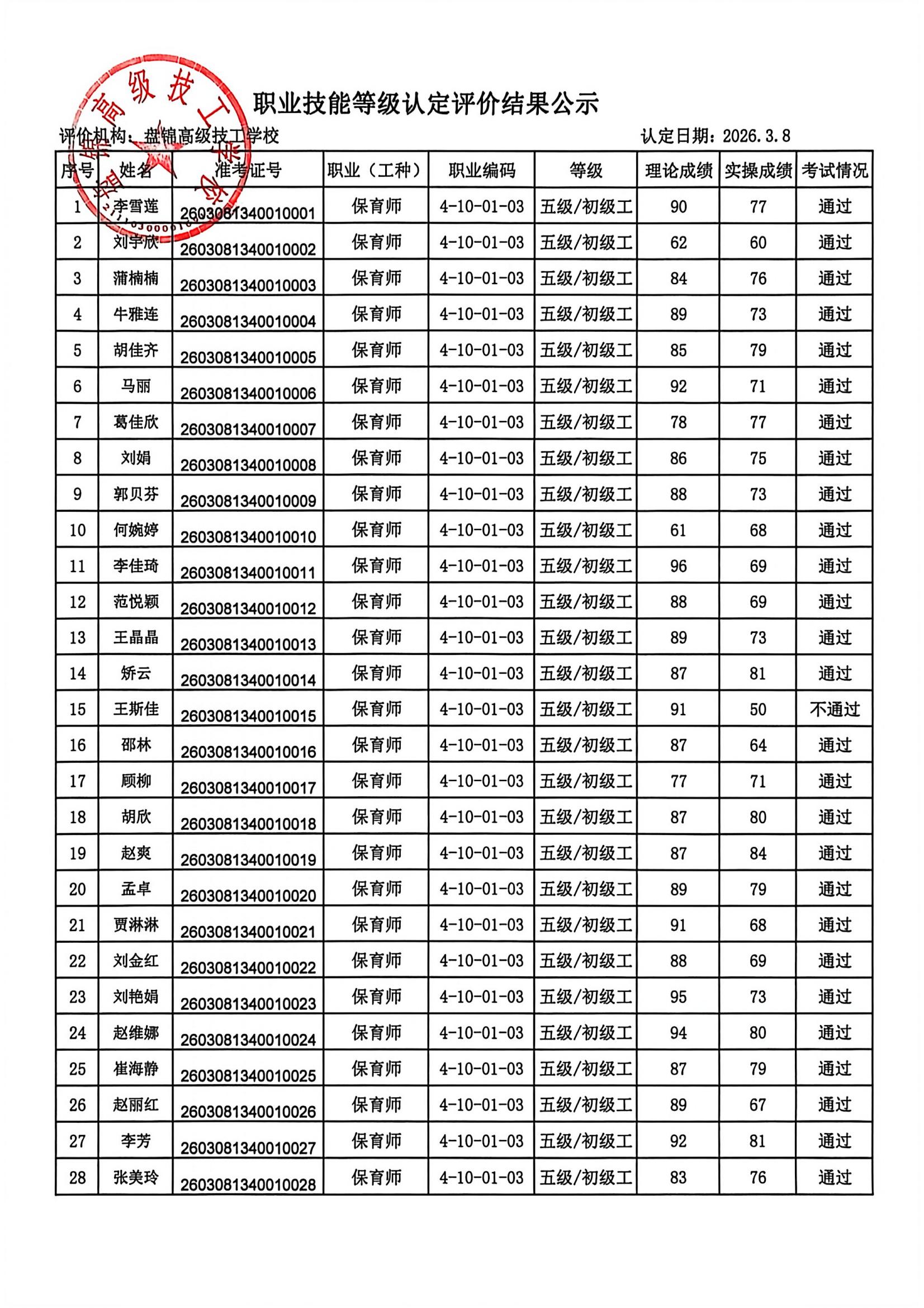 盘锦高级技工学校职业技能等级认定成绩公示(2026年第3批)