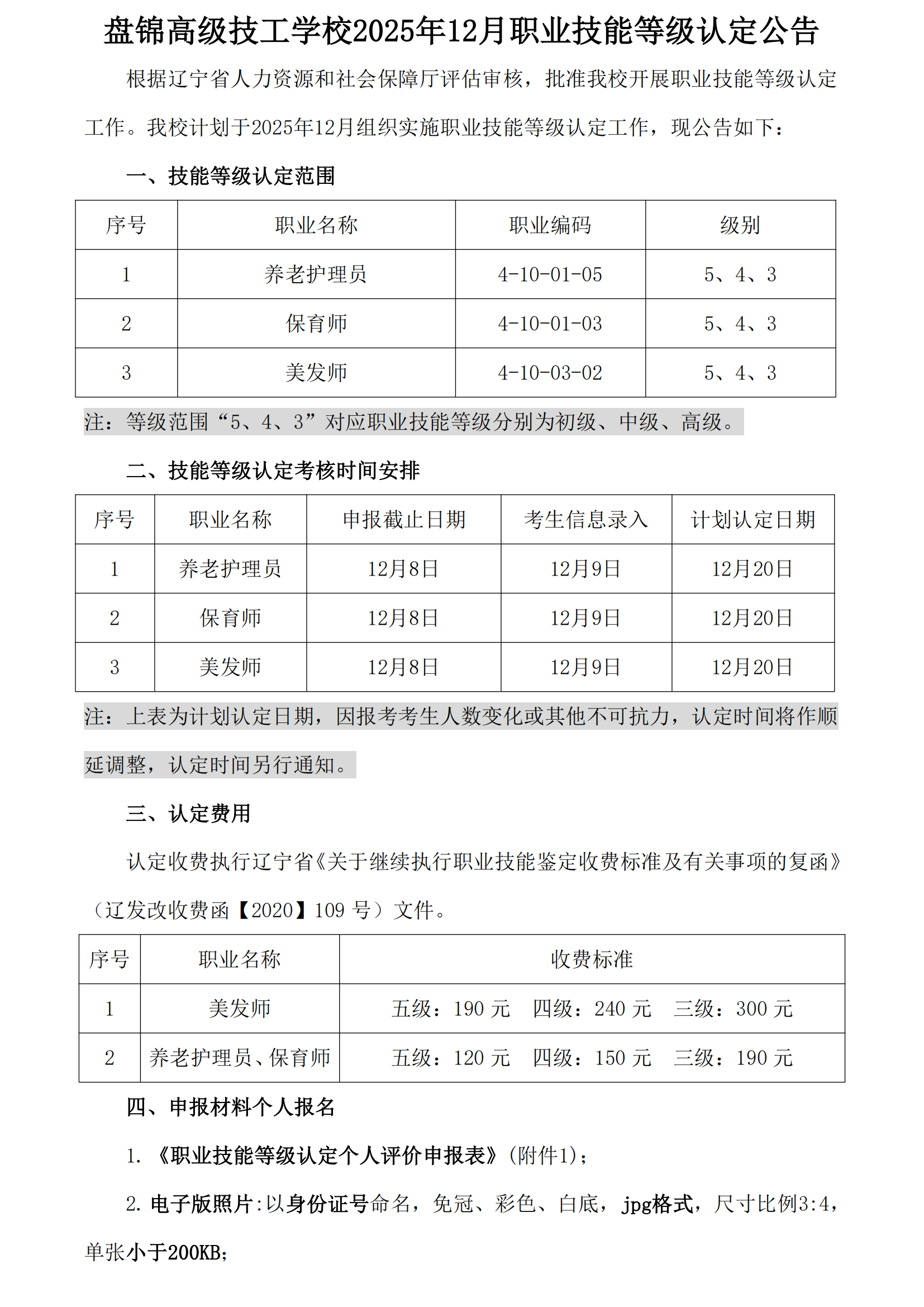 盘锦高级技工学校2025年12月职业技能等级认定公告